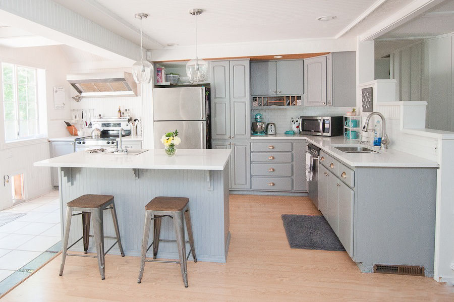 If a full gut and renovation isn’t in the budget, painting kitchen cabinets is a great budget-friendly option. We used chalk paint to give our cabinets and drawers a nice, modern, and neutral gray hue.